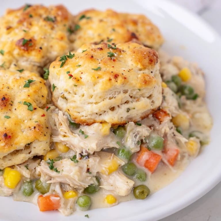 You've got protein, vegetables, a creamy sauce, and a bread-like topping all baking together, which means you're truly done once it hits the oven. Pair it with a simple green salad or coleslaw if you want something fresh alongside, but honestly, you don't need to. The filling stays moist without being soupy, and the biscuits absorb just enough of the steam to stay tender on the bottom while crisping on top.