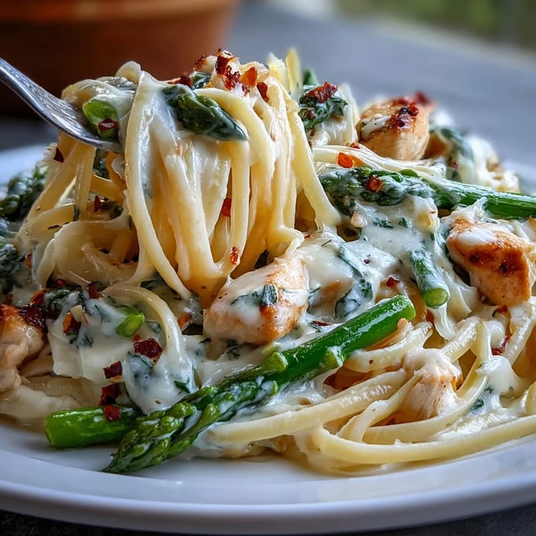 I made this for my partner on a random Tuesday, and he asked for seconds before finishing his first plate—which, for him, meant something genuine had happened in that bowl. There's a moment when you're tossing the linguine through that warm, creamy sauce with the crispy roasted asparagus and tender chicken where everything clicks into place, and you realize this is the kind of dish that doesn't need to be fancy to feel special.