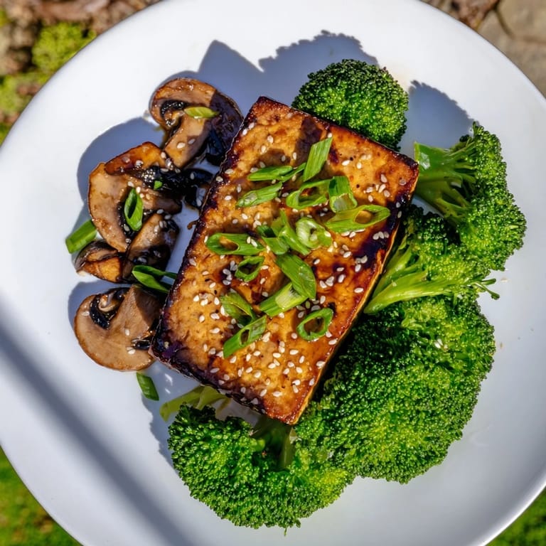 Save A savory, plant-based main featuring golden tofu steaks, tender broccoli, and earthy shiitake mushrooms in a flavorful soy-garlic sauce.