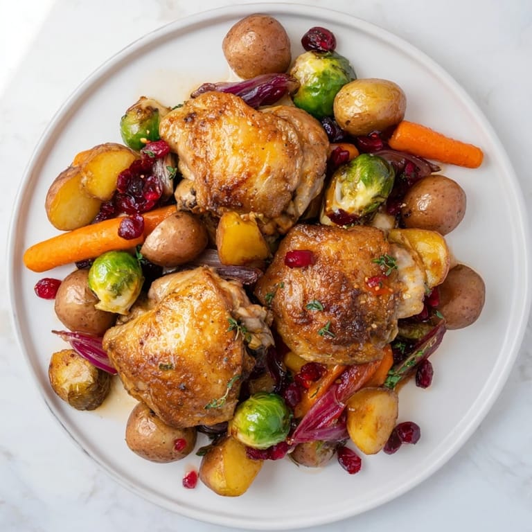 Save Tender roasted chicken and colorful vegetables baked on a single sheet pan, finished with a vibrant, tangy cranberry vinaigrette. A perfect, easy meal for busy weeknights.