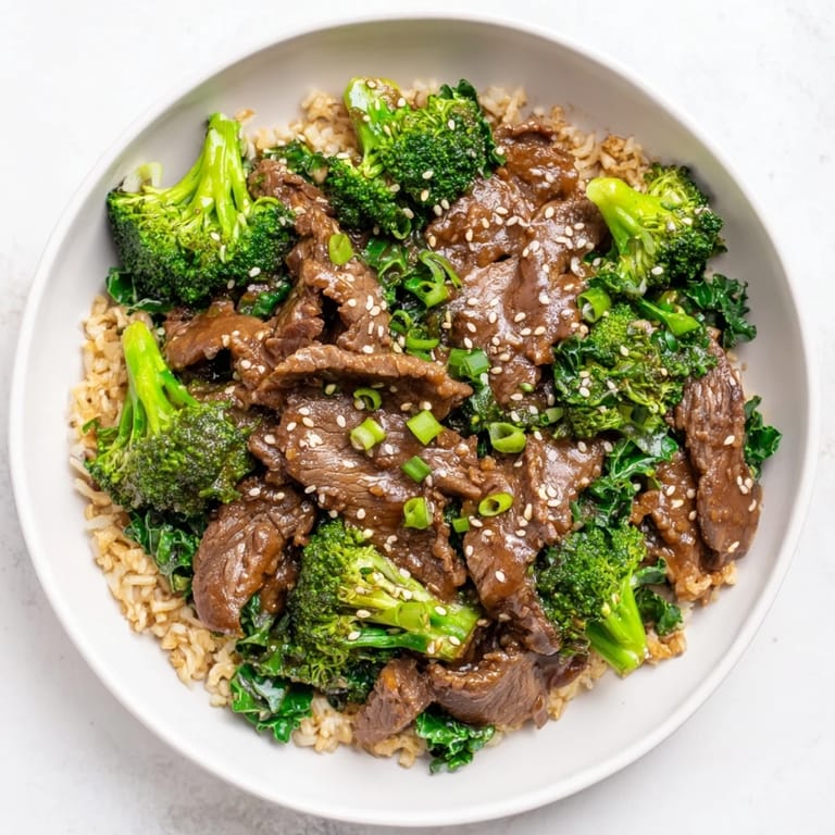 Save A comforting, wholesome dish featuring tender beef and broccoli simmered in a savory sauce, served over fluffy brown rice and fresh greens for a balanced meal.