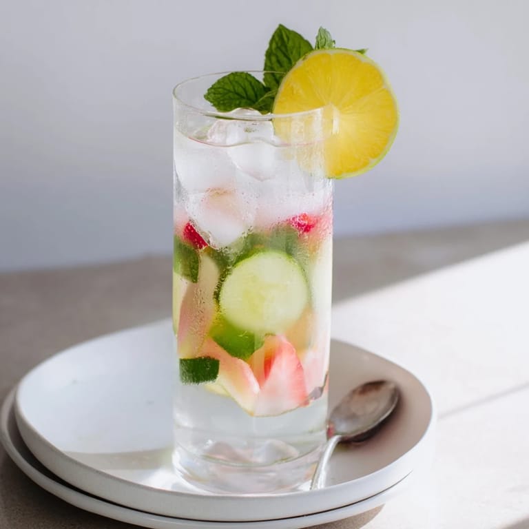 - Add the fresh fruit, cucumber, and mint to infuse flavor.