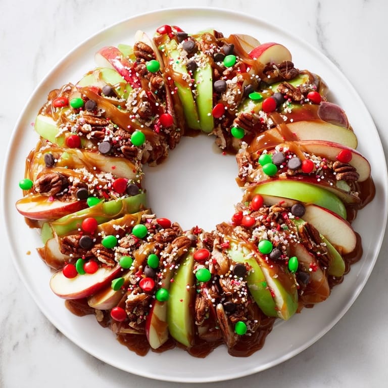 This festive dessert combines crisp apple wedges lightly tossed with lemon juice to maintain freshness, artfully arranged in a wreath shape. Soft caramel melted with cream is drizzled evenly over the apples, followed by ribbons of smooth melted chocolate. The top is finished with chopped nuts, colorful candy-coated chocolates, holiday sprinkles, and optional shredded coconut for extra texture and flair. Serve immediately or chill briefly for a cool, crisp bite. Ideal for cozy holiday gatherings, this visually stunning treat pairs wonderfully with warm cider or hot chocolate.