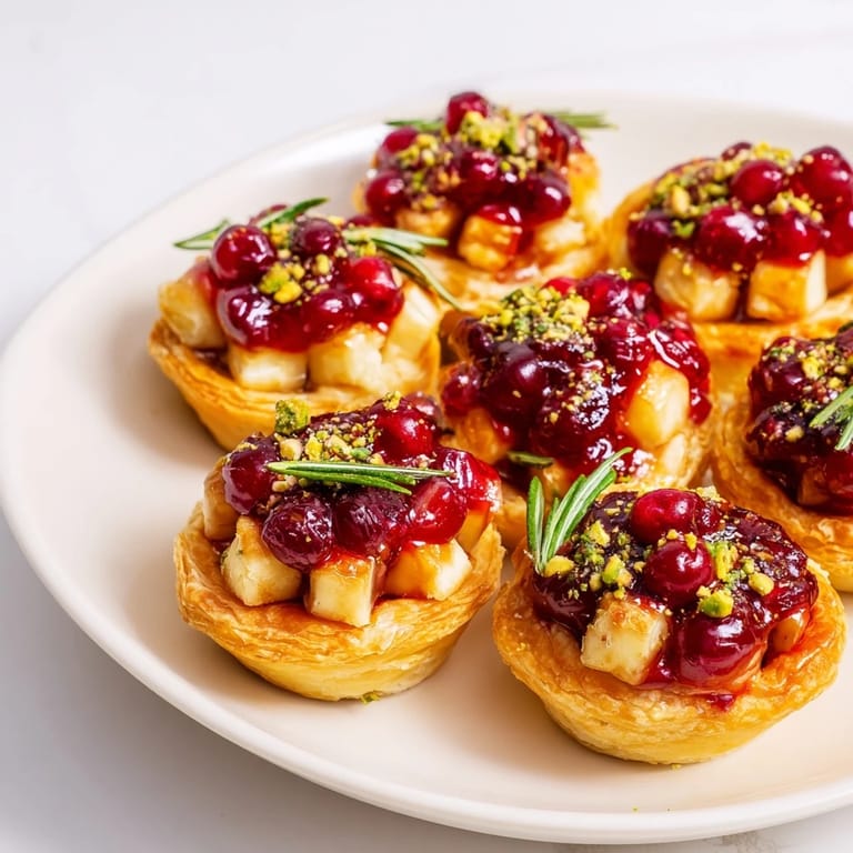 Save A festive, savory tartlet arrangement featuring creamy brie, tangy cranberry sauce, and golden puff pastry, perfect for holiday gatherings.