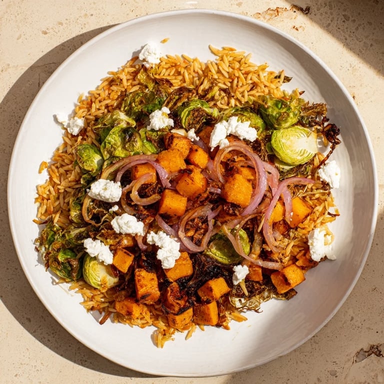 Save A vibrant autumn-inspired salad featuring roasted butternut squash, brussels sprouts, creamy goat cheese, and a sweet-tangy maple balsamic vinaigrette Perfect as a side or light main dish