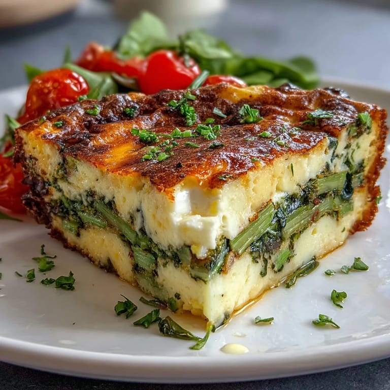 This spring frittata blends tender asparagus, baby spinach, zucchini, and cherry tomatoes with creamy goat cheese and fresh herbs. Whisked eggs create a light, fluffy texture that bakes evenly in the oven for a comforting dish. Cook vegetables briefly to retain freshness, then combine with the egg mixture and bake until puffed and set. Perfect for brunch or a quick dinner, this dish balances fresh garden flavors with rich dairy notes in a simple, Mediterranean-inspired preparation.
